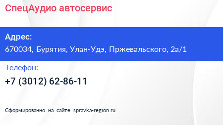 СпецАудио, автосервис по адресу 670034, Бурятия, Улан-Удэ, Пржевальского, 2а/1 в дальнейшем Организация, размещена в следующих категориях: