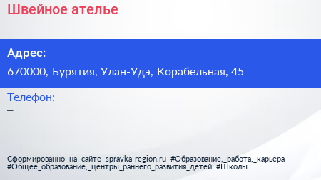 Швейное ателье по адресу 670000, Бурятия, Улан-Удэ, Корабельная, 45 в дальнейшем Организация, размещена в следующих категориях: