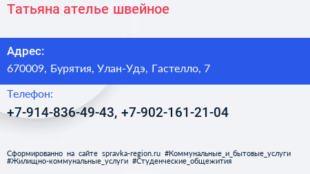 Татьяна, ателье швейное по адресу 670009, Бурятия, Улан-Удэ, Гастелло, 7 в дальнейшем Организация, размещена в следующих категориях: