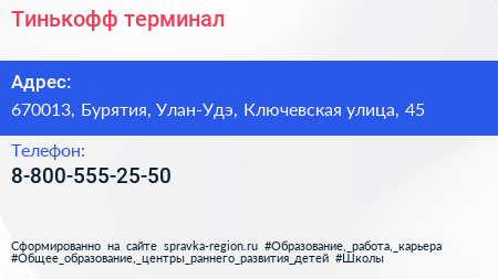 Тинькофф, терминал по адресу 670013, Бурятия, Улан-Удэ, Ключевская улица, 45 в дальнейшем Организация, размещена в следующих категориях:
