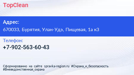 TopClean по адресу 670033, Бурятия, Улан-Удэ, Пищевая, 1а к3 в дальнейшем Организация, размещена в следующих категориях: