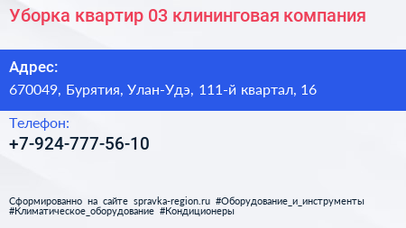 Уборка квартир 03, клининговая компания по адресу 670049, Бурятия, Улан-Удэ, 111-й квартал, 16 в дальнейшем Организация, размещена в следующих категориях: