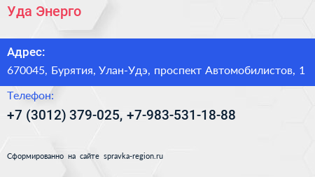 Уда-Энерго по адресу 670045, Бурятия, Улан-Удэ, проспект Автомобилистов, 1 в дальнейшем Организация, размещена в следующих категориях: