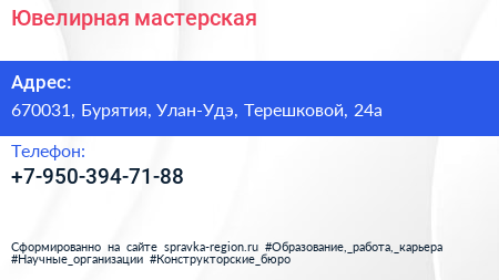 Ювелирная мастерская по адресу 670031, Бурятия, Улан-Удэ, Терешковой, 24а в дальнейшем Организация, размещена в следующих категориях: