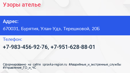 Узоры, ателье по адресу 670031, Бурятия, Улан-Удэ, Терешковой, 20Б в дальнейшем Организация, размещена в следующих категориях: