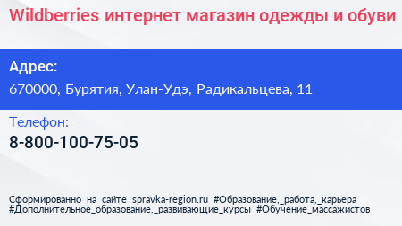 Wildberries, интернет-магазин одежды и обуви по адресу 670000, Бурятия, Улан-Удэ, Радикальцева, 11 в дальнейшем Организация, размещена в следующих категориях: