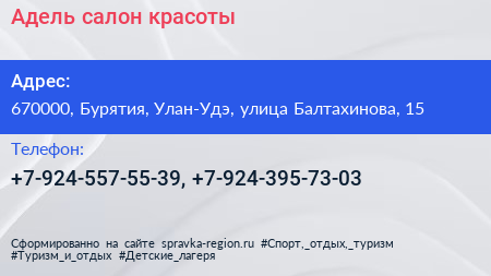 Адель, салон красоты по адресу 670000, Бурятия, Улан-Удэ, улица Балтахинова, 15 в дальнейшем Организация, размещена в следующих категориях: