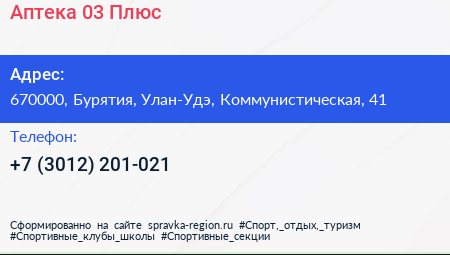 Аптека 03 Плюс по адресу 670000, Бурятия, Улан-Удэ, Коммунистическая, 41 в дальнейшем Организация, размещена в следующих категориях: