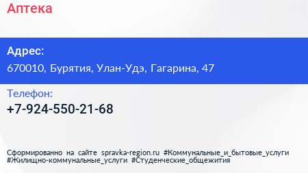 Аптека по адресу 670010, Бурятия, Улан-Удэ, Гагарина, 47 в дальнейшем Организация, размещена в следующих категориях: