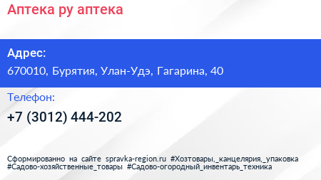 Аптека.ру, аптека по адресу 670010, Бурятия, Улан-Удэ, Гагарина, 40 в дальнейшем Организация, размещена в следующих категориях: