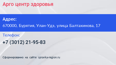 Арго, центр здоровья по адресу 670000, Бурятия, Улан-Удэ, улица Балтахинова, 17 в дальнейшем Организация, размещена в следующих категориях: