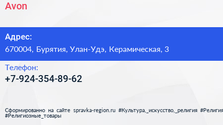 Avon по адресу 670004, Бурятия, Улан-Удэ, Керамическая, 3 в дальнейшем Организация, размещена в следующих категориях: