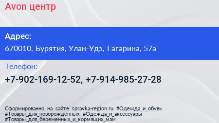 Avon, центр по адресу 670010, Бурятия, Улан-Удэ, Гагарина, 57а в дальнейшем Организация, размещена в следующих категориях: