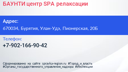 БАУНТИ, центр SPA-релаксации по адресу 670034, Бурятия, Улан-Удэ, Пионерская, 20Б в дальнейшем Организация, размещена в следующих категориях: