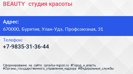 BEAUTY+, студия красоты по адресу 670000, Бурятия, Улан-Удэ, Профсоюзная, 31 в дальнейшем Организация, размещена в следующих категориях: