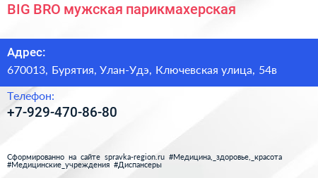 BIG BRO, мужская парикмахерская по адресу 670013, Бурятия, Улан-Удэ, Ключевская улица, 54в в дальнейшем Организация, размещена в следующих категориях:
