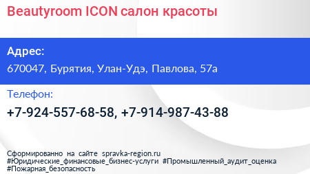 Beautyroom ICON, салон красоты по адресу 670047, Бурятия, Улан-Удэ, Павлова, 57а в дальнейшем Организация, размещена в следующих категориях: