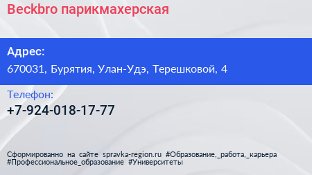 Beckbro, парикмахерская по адресу 670031, Бурятия, Улан-Удэ, Терешковой, 4 в дальнейшем Организация, размещена в следующих категориях: