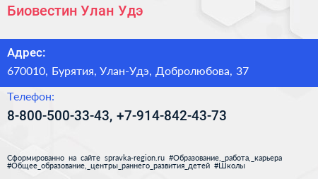 Биовестин Улан-Удэ по адресу 670010, Бурятия, Улан-Удэ, Добролюбова, 37 в дальнейшем Организация, размещена в следующих категориях: