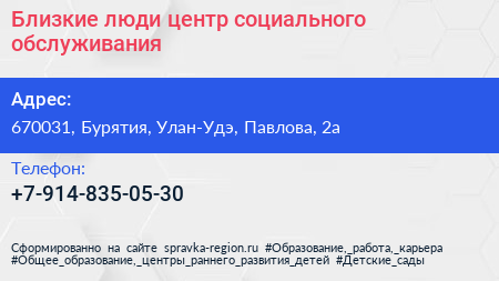Близкие люди, центр социального обслуживания по адресу 670031, Бурятия, Улан-Удэ, Павлова, 2а в дальнейшем Организация, размещена в следующих категориях: