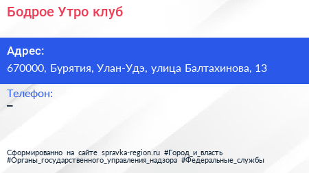 Бодрое Утро, клуб по адресу 670000, Бурятия, Улан-Удэ, улица Балтахинова, 13 в дальнейшем Организация, размещена в следующих категориях: