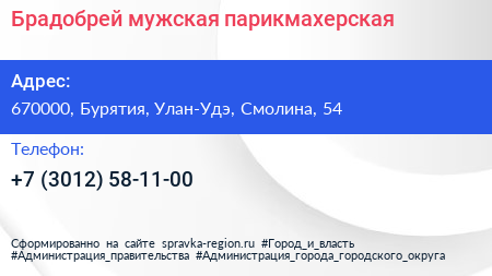 Брадобрей, мужская парикмахерская по адресу 670000, Бурятия, Улан-Удэ, Смолина, 54 в дальнейшем Организация, размещена в следующих категориях: