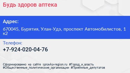 Будь здоров, аптека по адресу 670045, Бурятия, Улан-Удэ, проспект Автомобилистов, 1 к2 в дальнейшем Организация, размещена в следующих категориях: