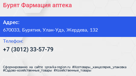 Бурят-Фармация, аптека по адресу 670033, Бурятия, Улан-Удэ, Жердева, 132 в дальнейшем Организация, размещена в следующих категориях:
