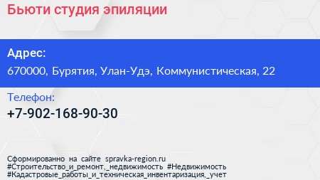 Бьюти, студия эпиляции по адресу 670000, Бурятия, Улан-Удэ, Коммунистическая, 22 в дальнейшем Организация, размещена в следующих категориях: