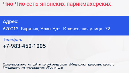 Чио Чио, сеть японских парикмахерских по адресу 670013, Бурятия, Улан-Удэ, Ключевская улица, 72 в дальнейшем Организация, размещена в следующих категориях: