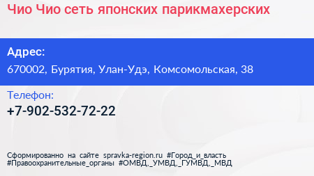 Чио Чио, сеть японских парикмахерских по адресу 670002, Бурятия, Улан-Удэ, Комсомольская, 38 в дальнейшем Организация, размещена в следующих категориях: