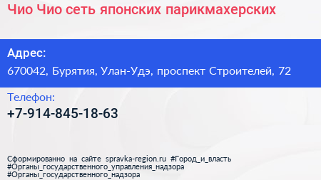 Чио Чио, сеть японских парикмахерских по адресу 670042, Бурятия, Улан-Удэ, проспект Строителей, 72 в дальнейшем Организация, размещена в следующих категориях: