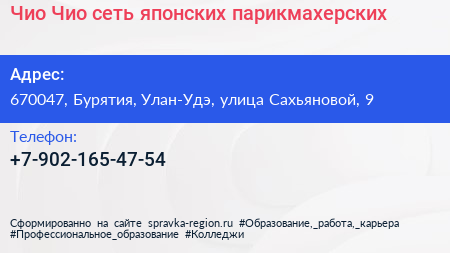Чио Чио, сеть японских парикмахерских по адресу 670047, Бурятия, Улан-Удэ, улица Сахьяновой, 9 в дальнейшем Организация, размещена в следующих категориях: