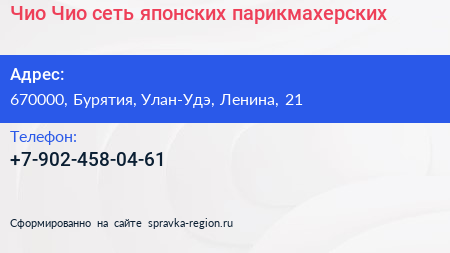 Чио Чио, сеть японских парикмахерских по адресу 670000, Бурятия, Улан-Удэ, Ленина, 21 в дальнейшем Организация, размещена в следующих категориях: