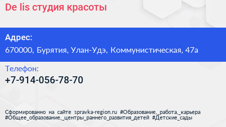 De-lis, студия красоты по адресу 670000, Бурятия, Улан-Удэ, Коммунистическая, 47а в дальнейшем Организация, размещена в следующих категориях: