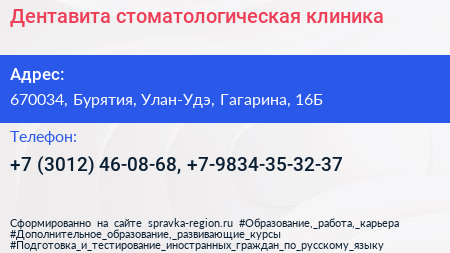 Дентавита, стоматологическая клиника по адресу 670034, Бурятия, Улан-Удэ, Гагарина, 16Б в дальнейшем Организация, размещена в следующих категориях: