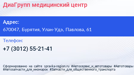 ДиаГрупп, медицинский центр по адресу 670047, Бурятия, Улан-Удэ, Павлова, 61 в дальнейшем Организация, размещена в следующих категориях: