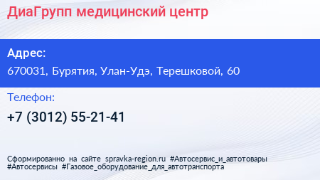 ДиаГрупп, медицинский центр по адресу 670031, Бурятия, Улан-Удэ, Терешковой, 60 в дальнейшем Организация, размещена в следующих категориях: