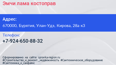 Эмчи-лама-костоправ по адресу 670000, Бурятия, Улан-Удэ, Кирова, 28а к3 в дальнейшем Организация, размещена в следующих категориях: