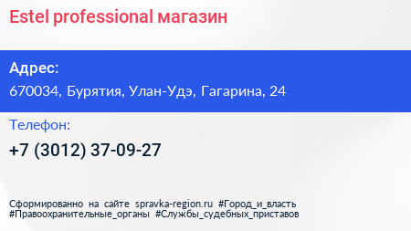 Estel professional, магазин по адресу 670034, Бурятия, Улан-Удэ, Гагарина, 24 в дальнейшем Организация, размещена в следующих категориях: