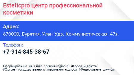 Esteticpro, центр профессиональной косметики по адресу 670000, Бурятия, Улан-Удэ, Коммунистическая, 47а в дальнейшем Организация, размещена в следующих категориях: