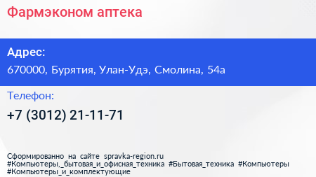 Фармэконом, аптека по адресу 670000, Бурятия, Улан-Удэ, Смолина, 54а в дальнейшем Организация, размещена в следующих категориях:
