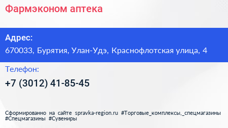 Фармэконом, аптека по адресу 670033, Бурятия, Улан-Удэ, Краснофлотская улица, 4 в дальнейшем Организация, размещена в следующих категориях: