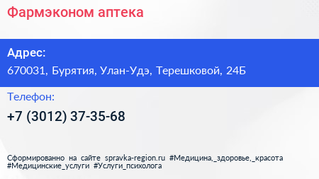 Фармэконом, аптека по адресу 670031, Бурятия, Улан-Удэ, Терешковой, 24Б в дальнейшем Организация, размещена в следующих категориях: