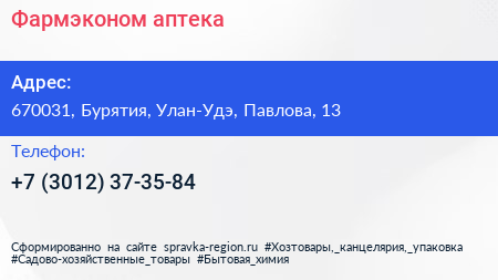 Фармэконом, аптека по адресу 670031, Бурятия, Улан-Удэ, Павлова, 13 в дальнейшем Организация, размещена в следующих категориях: