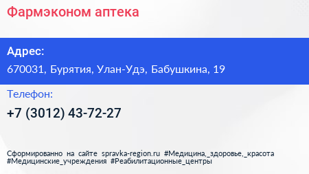 Фармэконом, аптека по адресу 670031, Бурятия, Улан-Удэ, Бабушкина, 19 в дальнейшем Организация, размещена в следующих категориях: