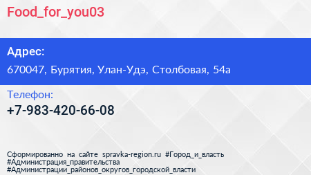 Food_for_you03 по адресу 670047, Бурятия, Улан-Удэ, Столбовая, 54а в дальнейшем Организация, размещена в следующих категориях: