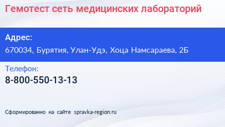Гемотест, сеть медицинских лабораторий по адресу 670034, Бурятия, Улан-Удэ, Хоца Намсараева, 2Б в дальнейшем Организация, размещена в следующих категориях: