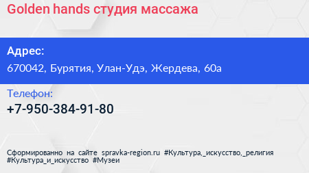 Golden hands, студия массажа по адресу 670042, Бурятия, Улан-Удэ, Жердева, 60а в дальнейшем Организация, размещена в следующих категориях: