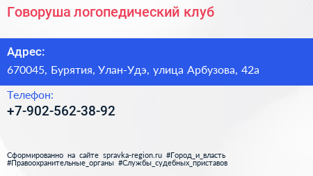 Говоруша, логопедический клуб по адресу 670045, Бурятия, Улан-Удэ, улица Арбузова, 42а в дальнейшем Организация, размещена в следующих категориях:
